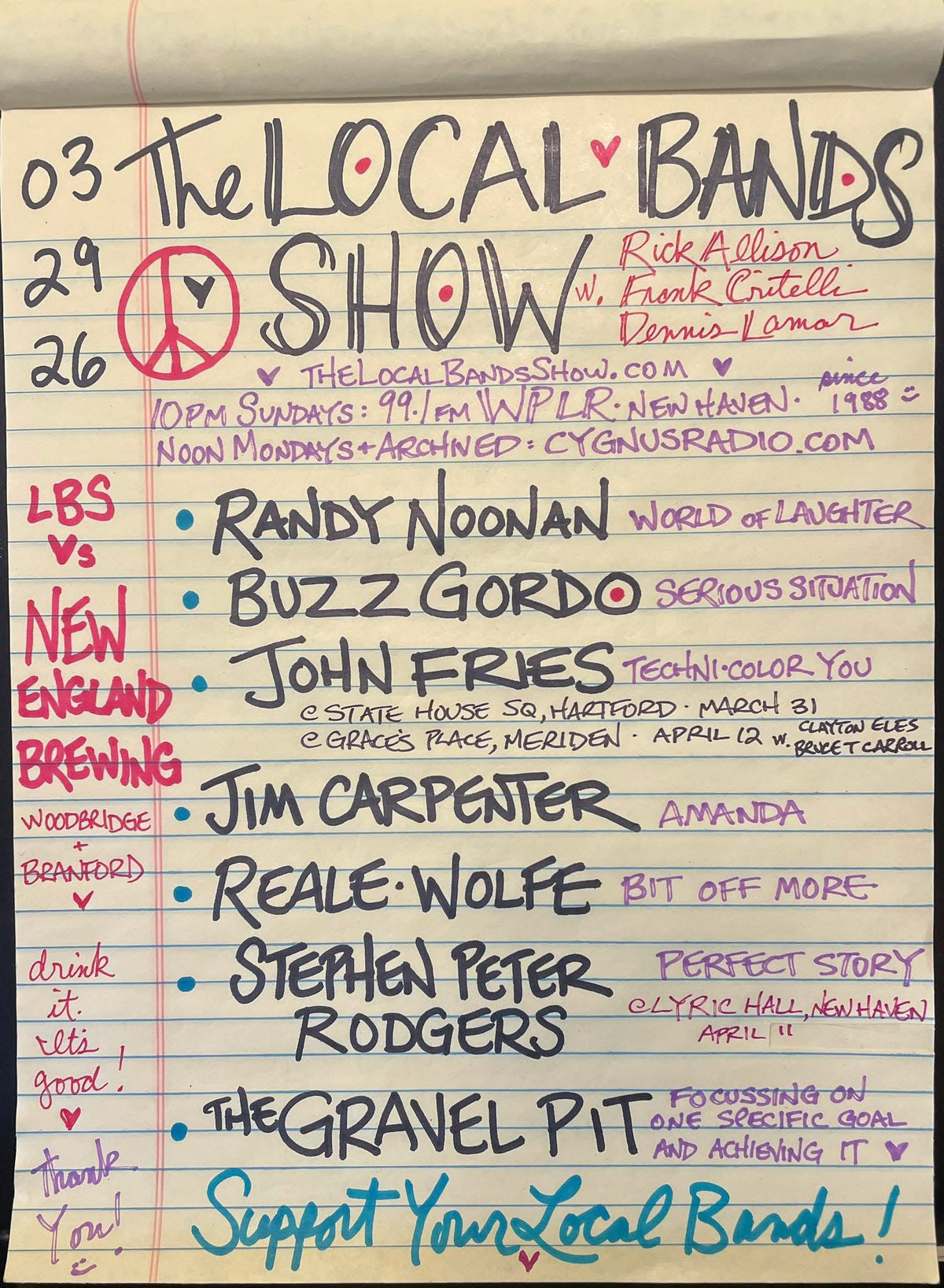 Since 1988, The Local Bands Show has been on the air bringing you the best the New England music scene has to offer. Rick Allison, Frank Critelli and Dennis Lamar leave no stone unturned in their quest to find new and exciting music from local bands and regional musicians, whether they are weekend warriors, hometown heroes or national acts that got their start right here! Tune in at 10PM on Sundays on WPLR or noon on Mondays at CygnusRadio.com!