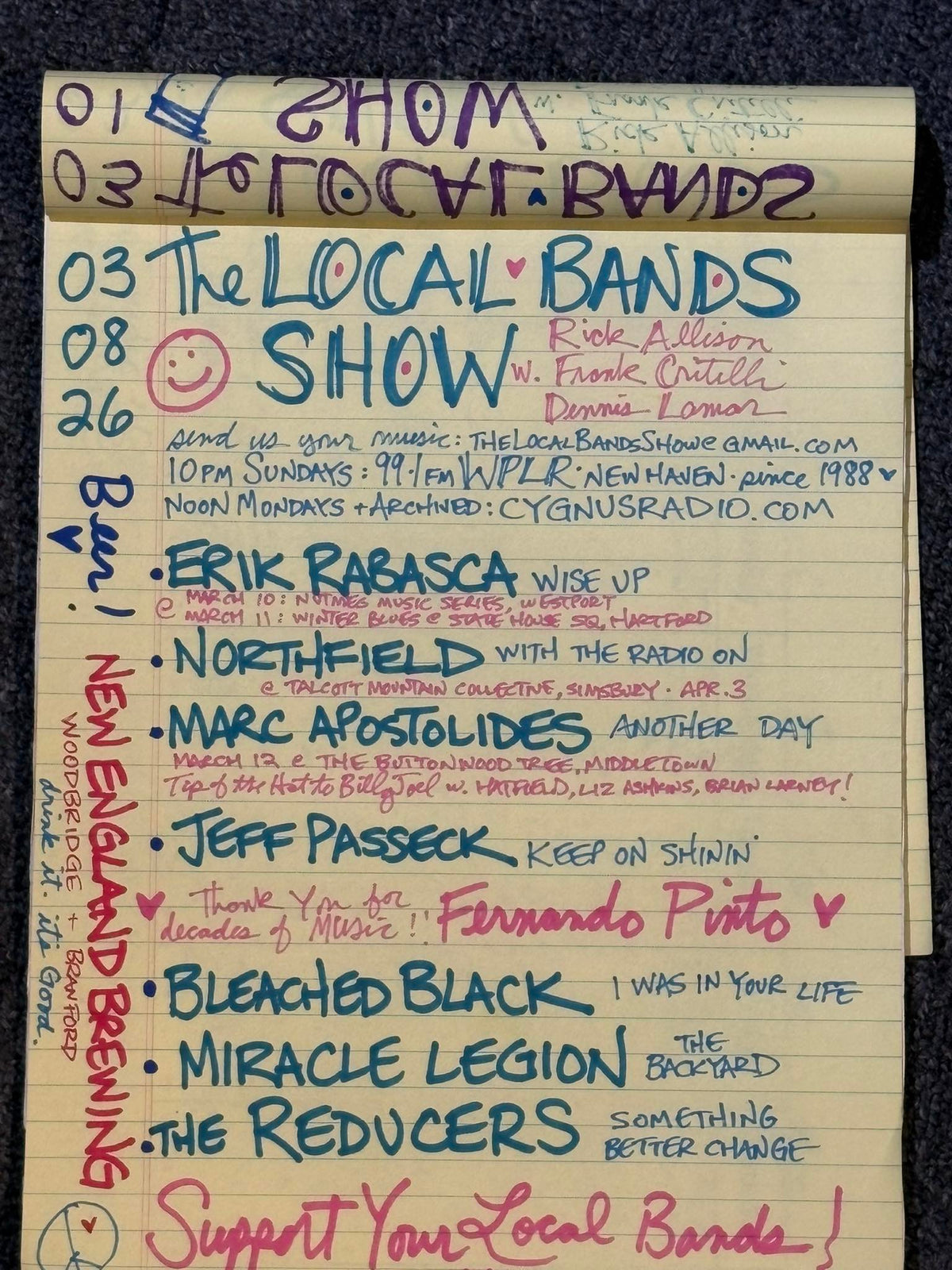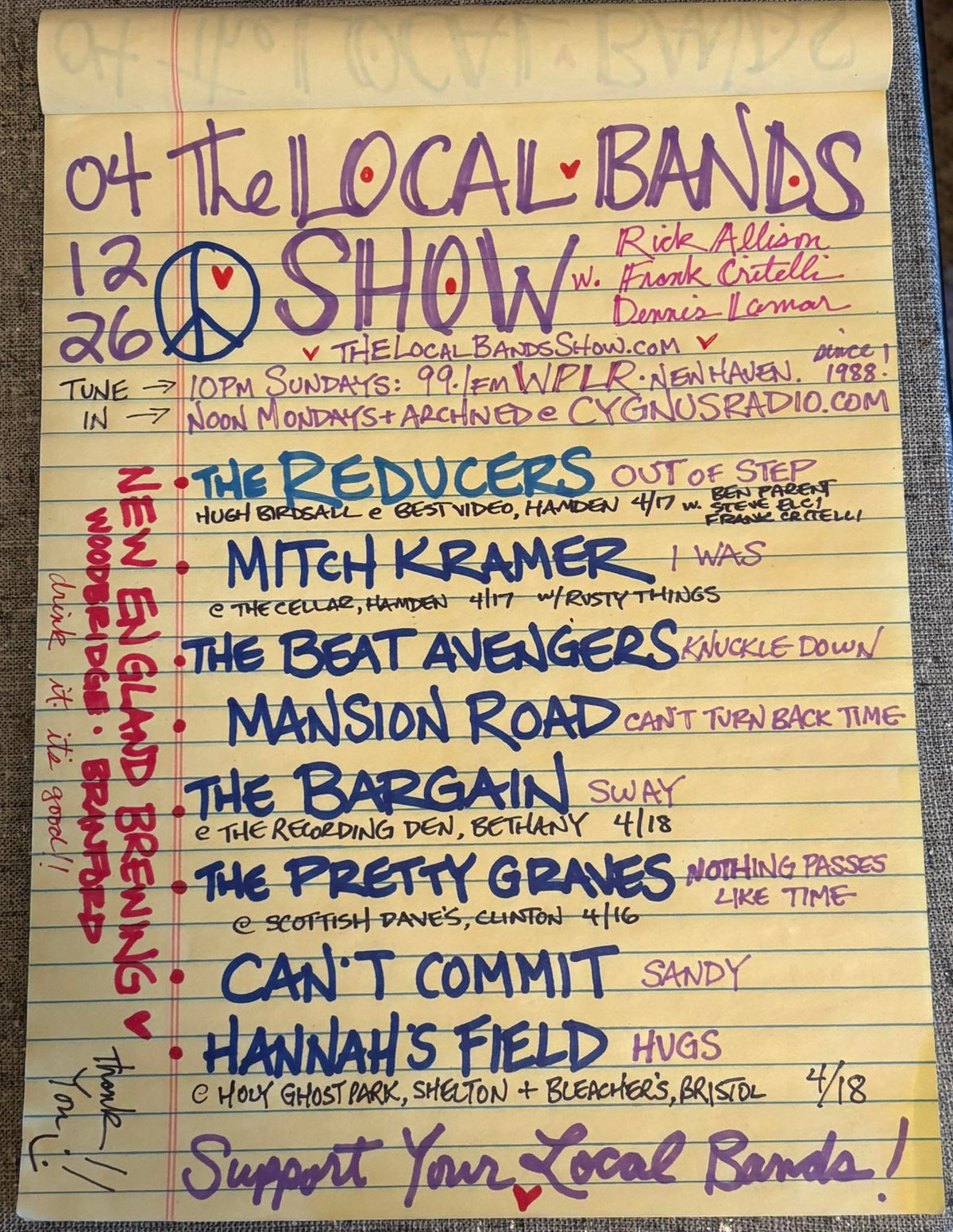Since 1988, The Local Bands Show has been on the air bringing you the best the New England music scene has to offer. Rick Allison, Frank Critelli and Dennis Lamar leave no stone unturned in their quest to find new and exciting music from local bands and regional musicians, whether they are weekend warriors, hometown heroes or national acts that got their start right here! Tune in at 10PM on Sundays on WPLR or noon on Mondays at CygnusRadio.com!
